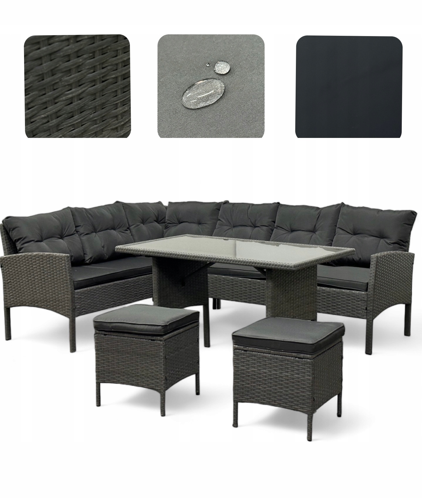 ZESTAW KOMPLET MEBLI OGRODOWYCH SFS079 NAROŻNIK TECHNORATTAN SZARY Zawartość zestawu narożnik puf stół